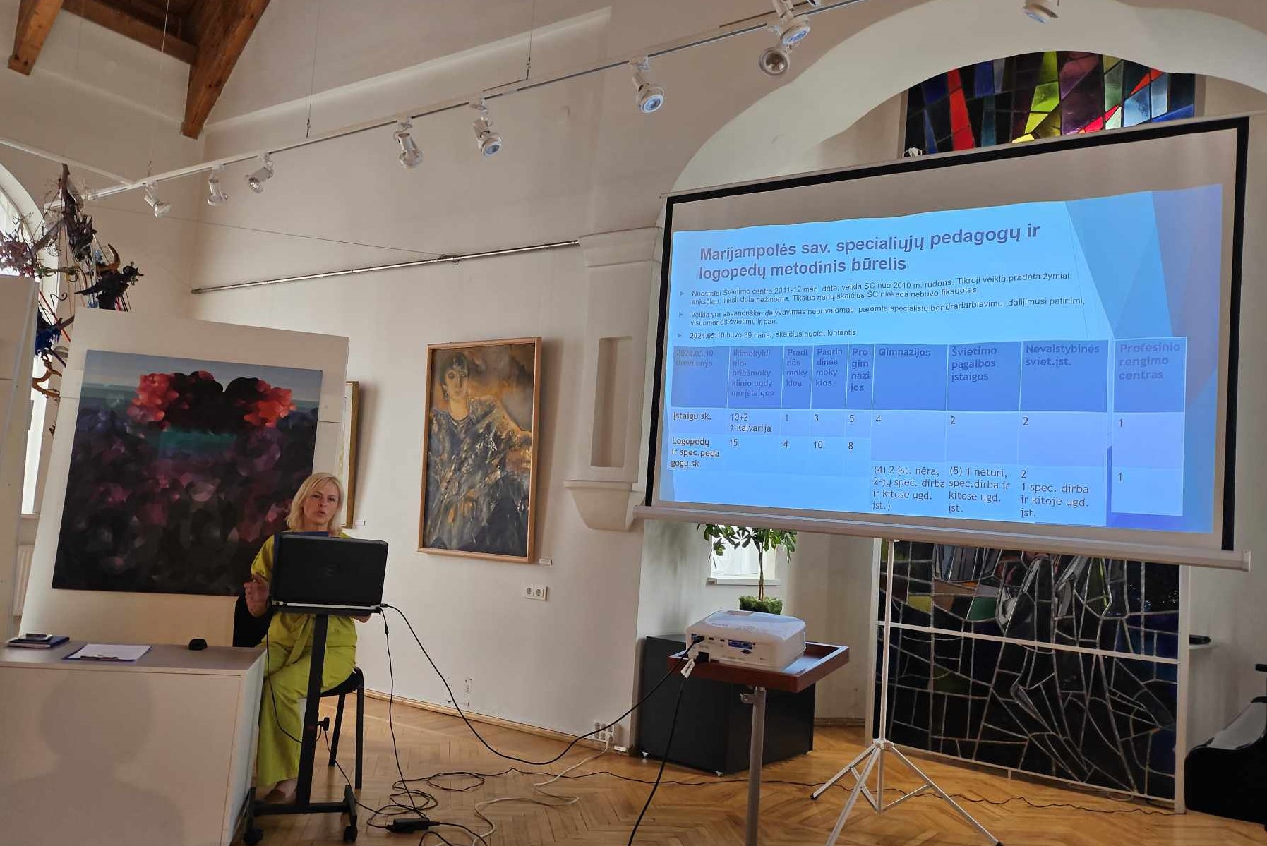 Toliau vykome į Marijampolės Meilės Lukšienės švietimo centrą. Ten mus pasitiko Švietimo centro metodininkas V. Dilius, kuris supažindino su švietimo centro veikla, stebėjome trumpą filmuką apie Marijampolės miestą. Vaikų lopšelio-darželio „Pasaka“ logopedė, specialioji pedagogė G. Dagilienė dalijosi patirtimi tema „Rašymo įgūdžiai ir jų lavinimas“. Marijampolės metodinio būrelio pirmininkė D. Muckuvienė pristatė Marijampolės sav. specialiųjų pedagogų, logopedų metodinę veiklą. Telšių PPT specialioji pedagogė V. Lukošienė dalijosi gerąja darbo patirtimi įgyvendinant įtraukųjį ugdymą Telšių rajone, o Telšių metodinio būrelio pirmininkė E. Rudnickienė pristatė rajono specialiųjų pedagogų, logopedų metodinę veiklą, specialistų patirtis. Vėliau draugiškai diskutavome įvairiais rūpimais klausimais, aptarėme klausimus, susijusius su tiesiogine specialistų veikla, švietimo pagalba, dokumentais ir t.t.