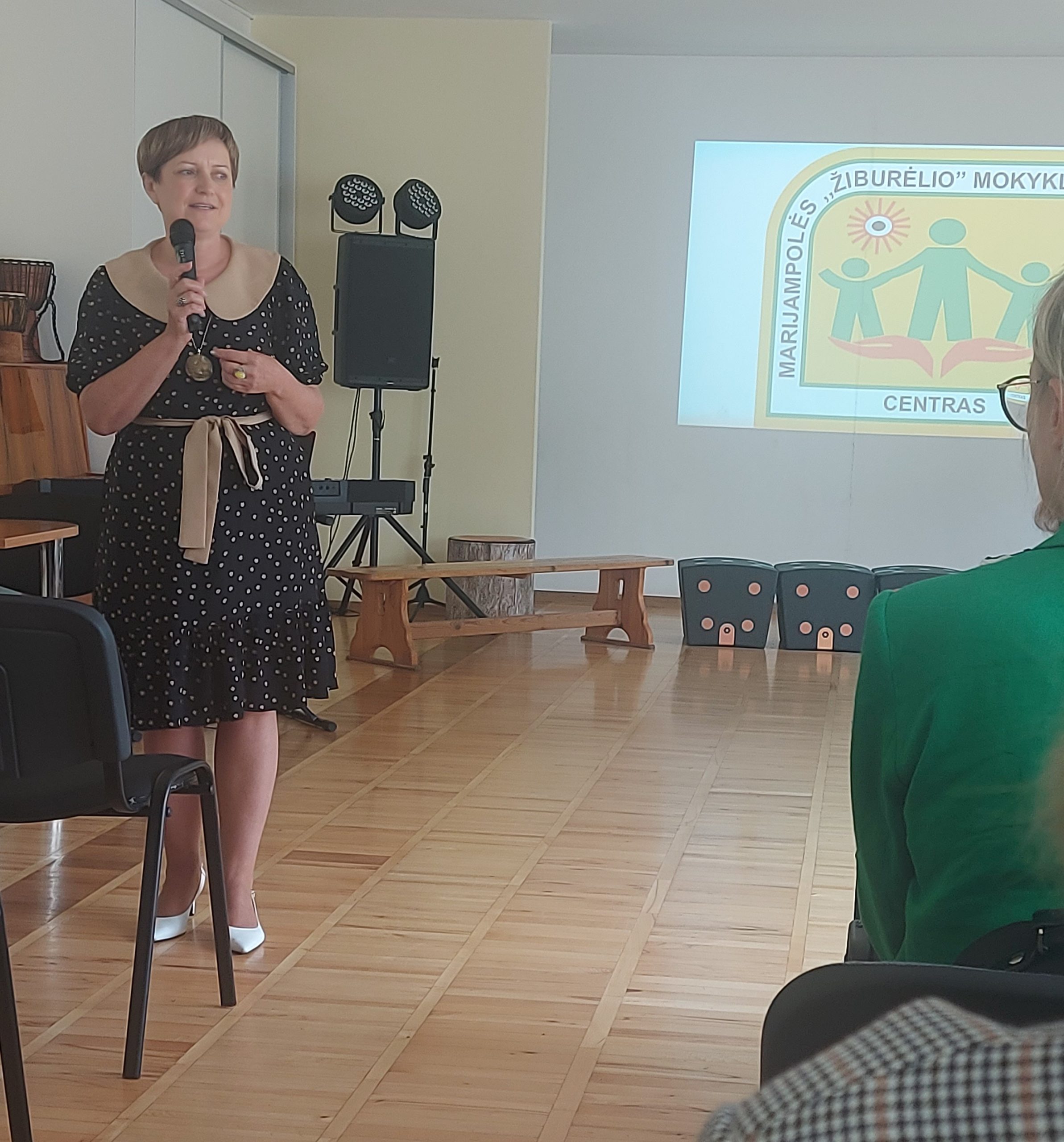 Atvykę į Suvalkijos sostinę apsilankėme Marijampolės „Žiburėlio“ daugiafunkciniame centre, kur direktorė R. Kukalienė supažindino su įstaigos veikla, ugdymo erdvėmis, vaikų turinčių ypatingų poreikių galimybėmis dalyvauti muzikinėje veikloje. Daugiafunkciame centre mūsų kolektyvą šiltai sutiko Marijampolės savivaldybės Švietimo, kultūros ir sporto skyriaus vyr. specialistė K. Gurauskienė, kuri pristatė rajono įtraukiojo veiklas ir atsakė į mums rūpimus klausimus.