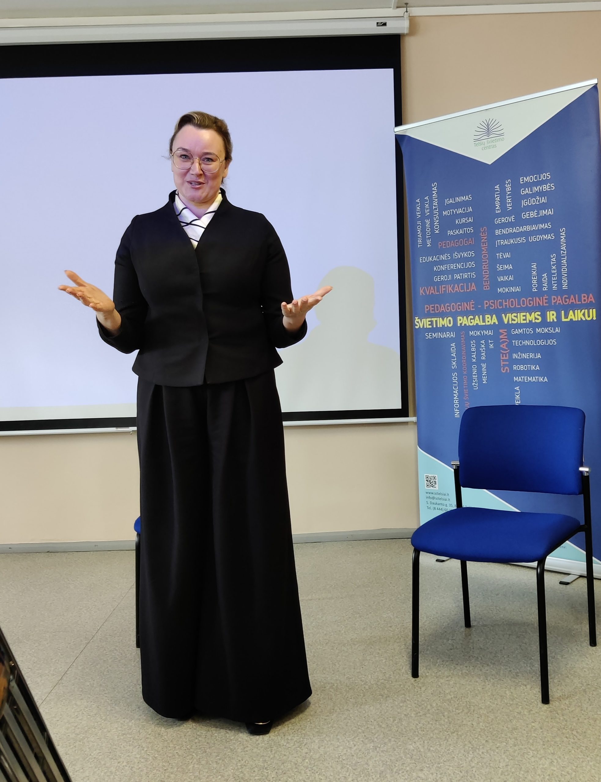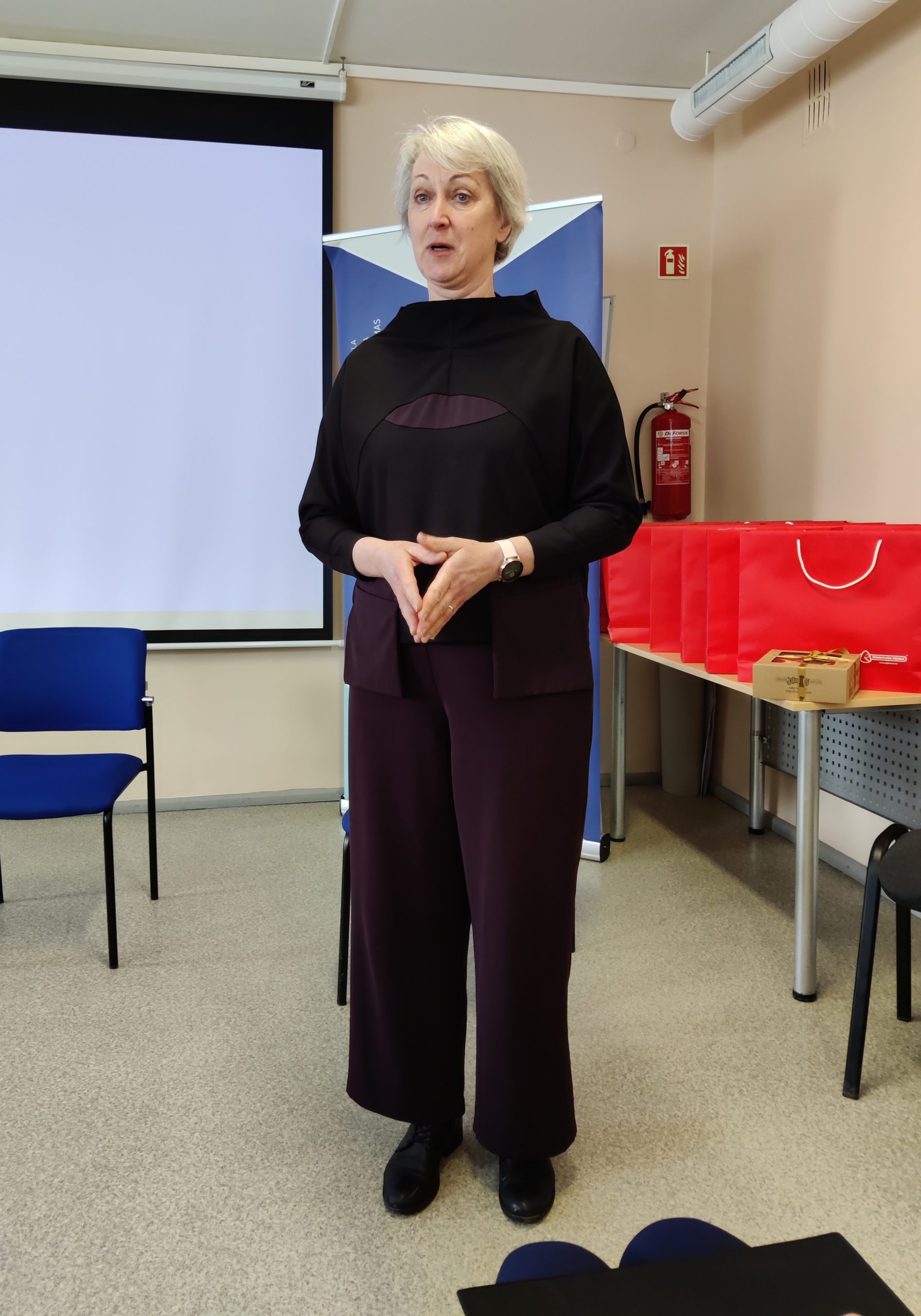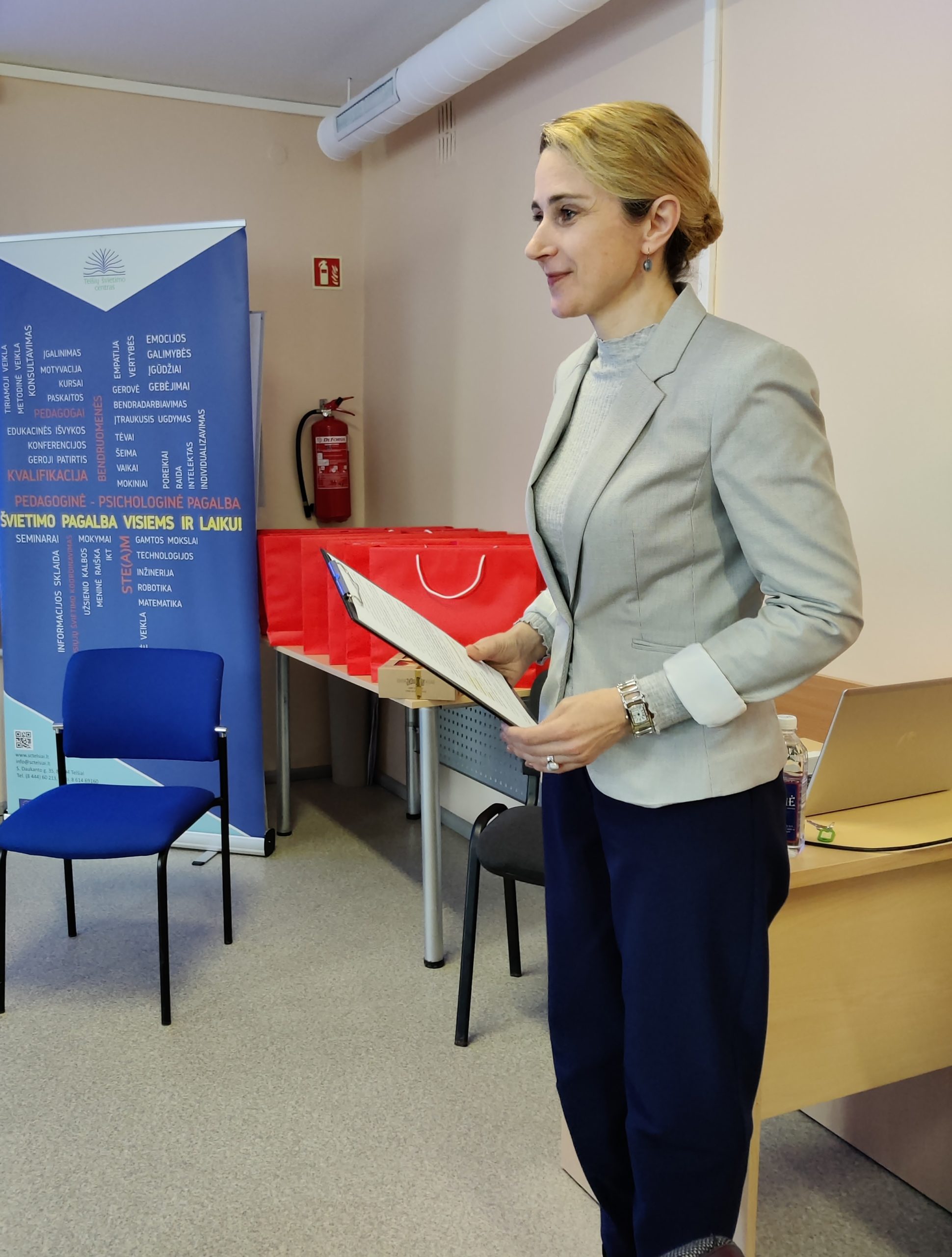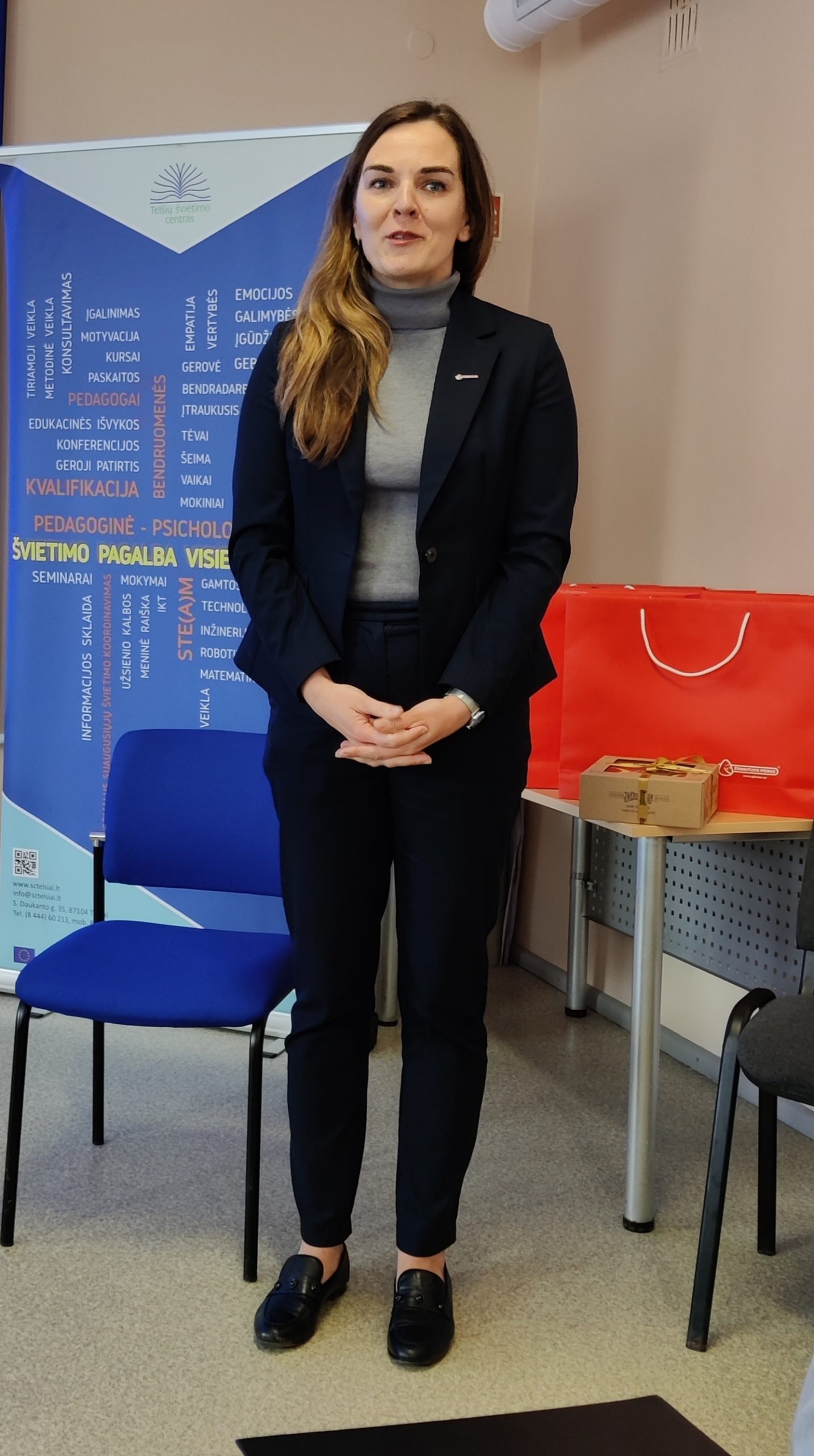 Pranešėja Neringa Bekerienė, projekto partnerės-įmonės AB „Žemaitijos pienas“ Personalo skyriaus vadovė, skaitė pranešimą „AB „Žemaitijos pienas“ – mokslo, studijų ir karjeros partneris“. Dalyviai išgirdo apie įmonės konkrečius veiksmus, kuriais siekiama mokinius, baigusius studijas, susigrąžinti į savo gimtąjį miestą.