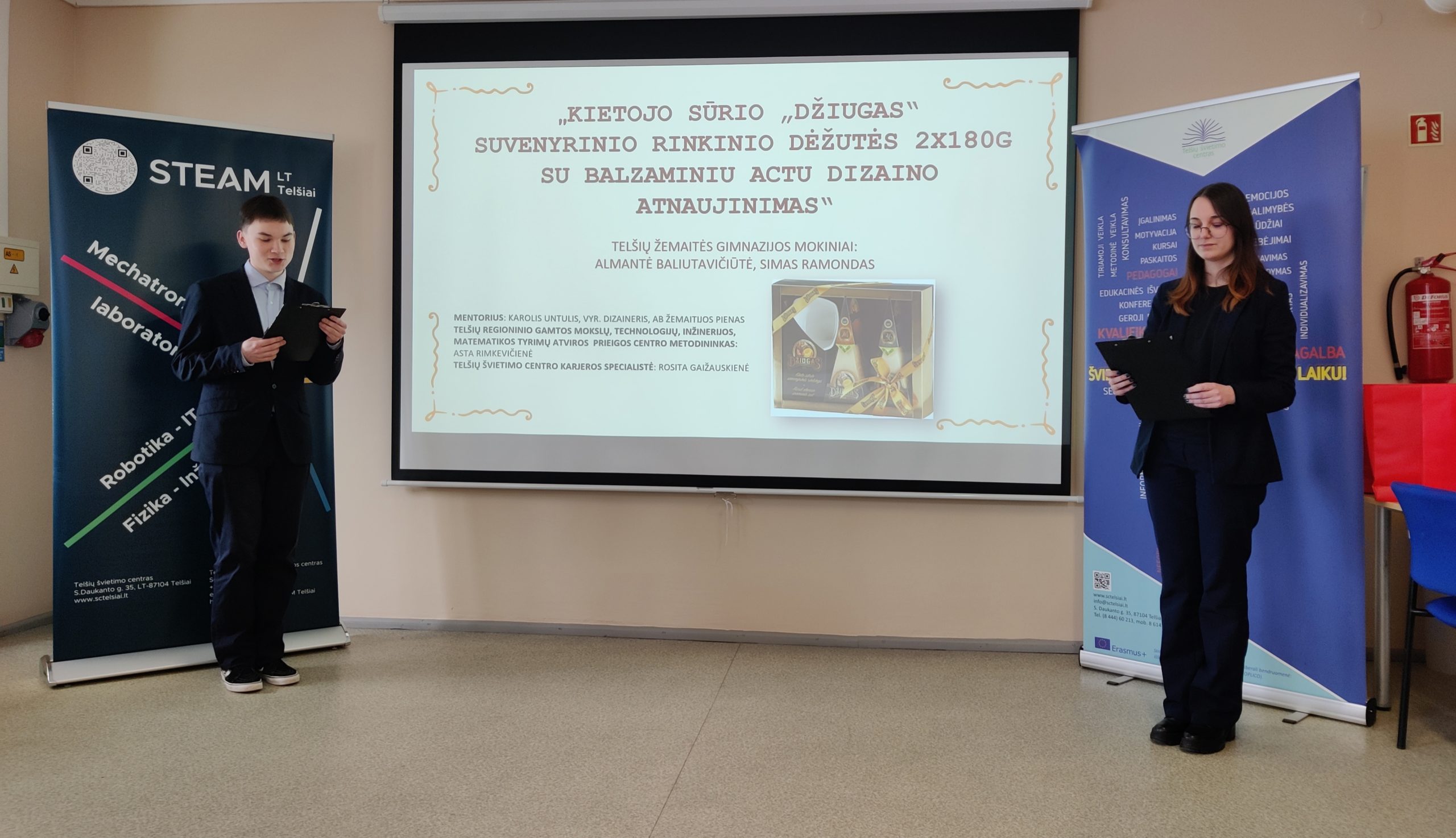 Projektinių darbų rezultatus pristatė septynios mokinių komandos. Net penkios iš jų atliko užduotis, susijusias su užkandžių dėžučių projektavimu. Telšių Vincento Borisevičiaus gimnazijos I klasės mokiniai Grantas Vasiliauskas ir Matas Navikas atliko rinkos tyrimą, kurio metu išsiaiškino, kuris iš trijų pieno produktų – „Magija“, „Pik Nik“ ir „Džiugas“ – mokiniams yra skaniausias. Taip pat sužinojo, su kokiais papildomais užkandžiais vaikai norėtų sukomplektuoti dėžutes. Žinodami šią informaciją, kitų komandų mokiniai sukūrė originalias užkandžių dėžutes: Telšių Vincento Borisevičiaus gimnazijos I klasės mokinės Mėta Dargytė ir Emilija Jonutytė – „Magija“; Telšių r. Luokės Vytauto Kleivos gimnazijos I klasės mokinių komanda, Gabija Koniuchovaitė, Raminta Ligeikytė, Brigita Navickaitė ir Gvidas Petrošas – „PIK NIK“; Telšių „Kranto“ progimnazijos 8 klasės mokiniai Andrėja Zakarauskaitė, Izabelė Šmataitė ir Jonas Jurevičius – „Džiugo“ užkandžių dėžutę. Telšių Žemaitės gimnazijos vienuoliktokai Almantė Baliutavičiūtė ir Simas Ramondas kūrė kietojo sūrio „Džiugas“ suvenyrinio rinkinio dėžutės naują dizainą. Dar du mokinių darbai buvo susiję su laboranto ir mikrobiologo profesijomis. Telšių r. Varnių Motiejaus Valančiaus gimnazijos jaunieji chemikai, II klasės mokiniai Miglė Bajorūnaitė, Gabija Statkutė, Rugilė Rekašiutė ir Emilija Makarytė atliko ir pristatė tyrimą „Bendrojo fosforo nustatymas nuotekose“. Telšių r. Tryškių Lazdynų Pelėdos gimnazijos vienuoliktokai Emilija Pranauskytė, Urtė Akučkaitė, Ugnė Žulkutė bei Augustas Muškauskas tyrinėjo mikrobų atsparumą dezinfekcinėms priemonėms. Rezultatai atskleidė rankų higienos svarbą ligų sezonu bei dirbant su maisto produktais. Gimnazistai savo pristatymuose supažindino klausytojus su darbų eiga, rezultatais, papasakojo, su kokia profesija susipažino išsamiau.